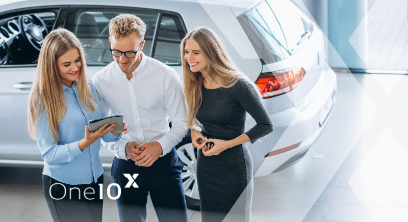 Three Young Professionals Review Information on a Tablet Beside a White Car in a Showroom; One10x Logo Visible in the Corner.